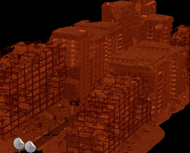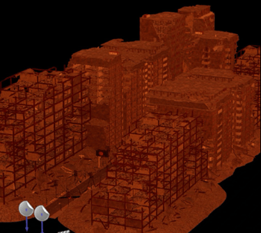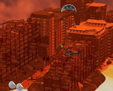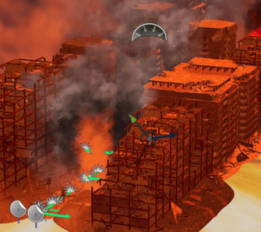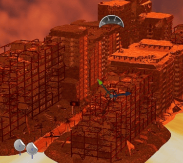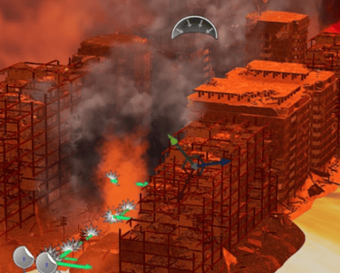 The scene utilizes the atmosphere to convey a sense of depth. As the distance increases, the atmospheric ratio density is heightened. This density is not only a result of distance, but also due to the high temperature that increases the smoke density. The smoke is used to create the atmosphere and divert the viewer's attention. Additionally, the atmosphere allows the viewer to engage with and learn more about nearby elements.