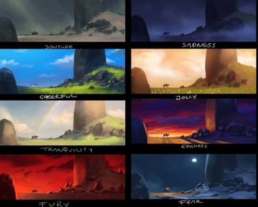 The use of red and yellow colors in the atmosphere creates an air of mystery for the viewer, which aligns with the emotions intended by the script. The atmosphere is employed to remove boundaries around the viewer's focus area, and the color and atmosphere are used in tandem to evoke the desired emotions.