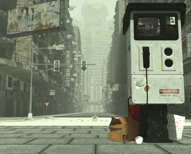 The camera moves away from the phone box and rises up, revealing a view of the city from the top of a building.